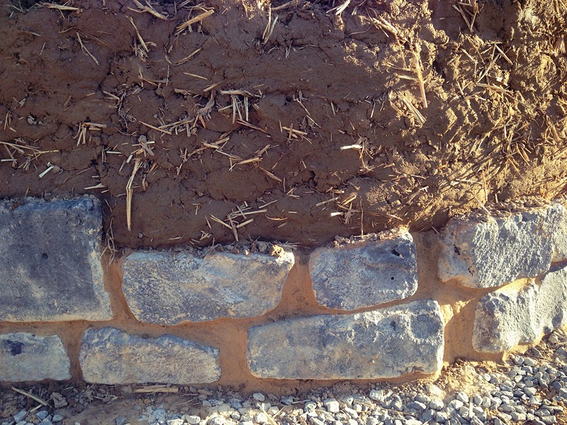 On the inside you can see regular red bricks, these were used to widen the foundation to accommodate the cob walls. Regular bricks are much cheaper than blue stone, & will be covered once the floor is layed :)